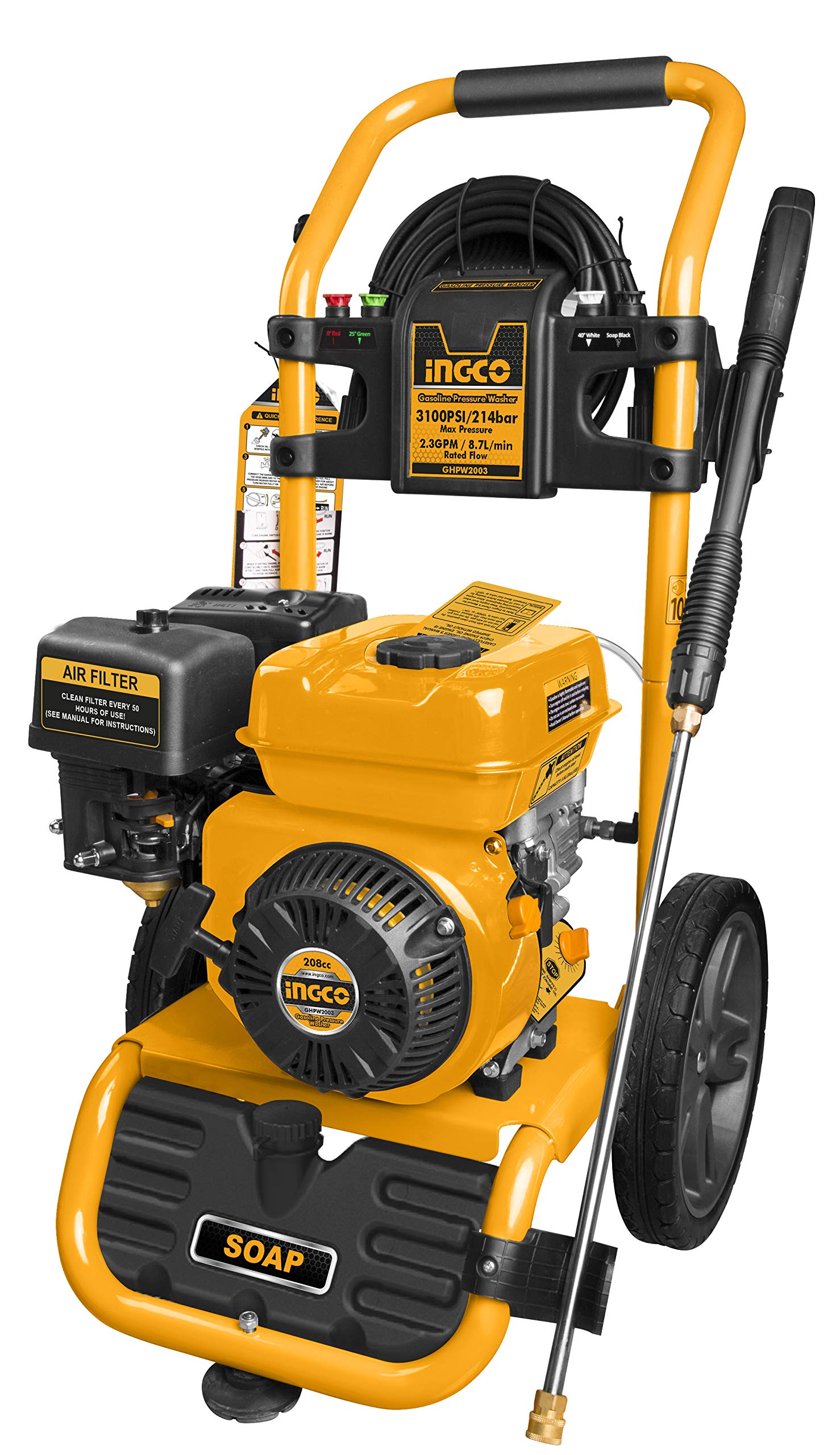 This high-performance axial pump is built with a durable brass pump head and comes equipped with a 7.0HP OHV 4-stroke engine, ensuring reliable power and efficiency. Designed for long-lasting use, the pump offers a maximum pressure of 235 bar (3450 psi) and a flow rate of 9.5L/min (2.5GPM), making it suitable for heavy-duty tasks. It features a 212cc engine with a recoil starting system, operating at 3600rpm. The pump is designed to function for up to 300 hours and includes a convenient oil-changing feature. With a fuel tank capacity of 3.6L and an oil volume of 0.6L, it runs on unleaded gasoline. Accessories include a metal lance, a metal gun, a 9.1m pressure hose, and four nozzles, all neatly packed in a carton box for easy transport and storage.
